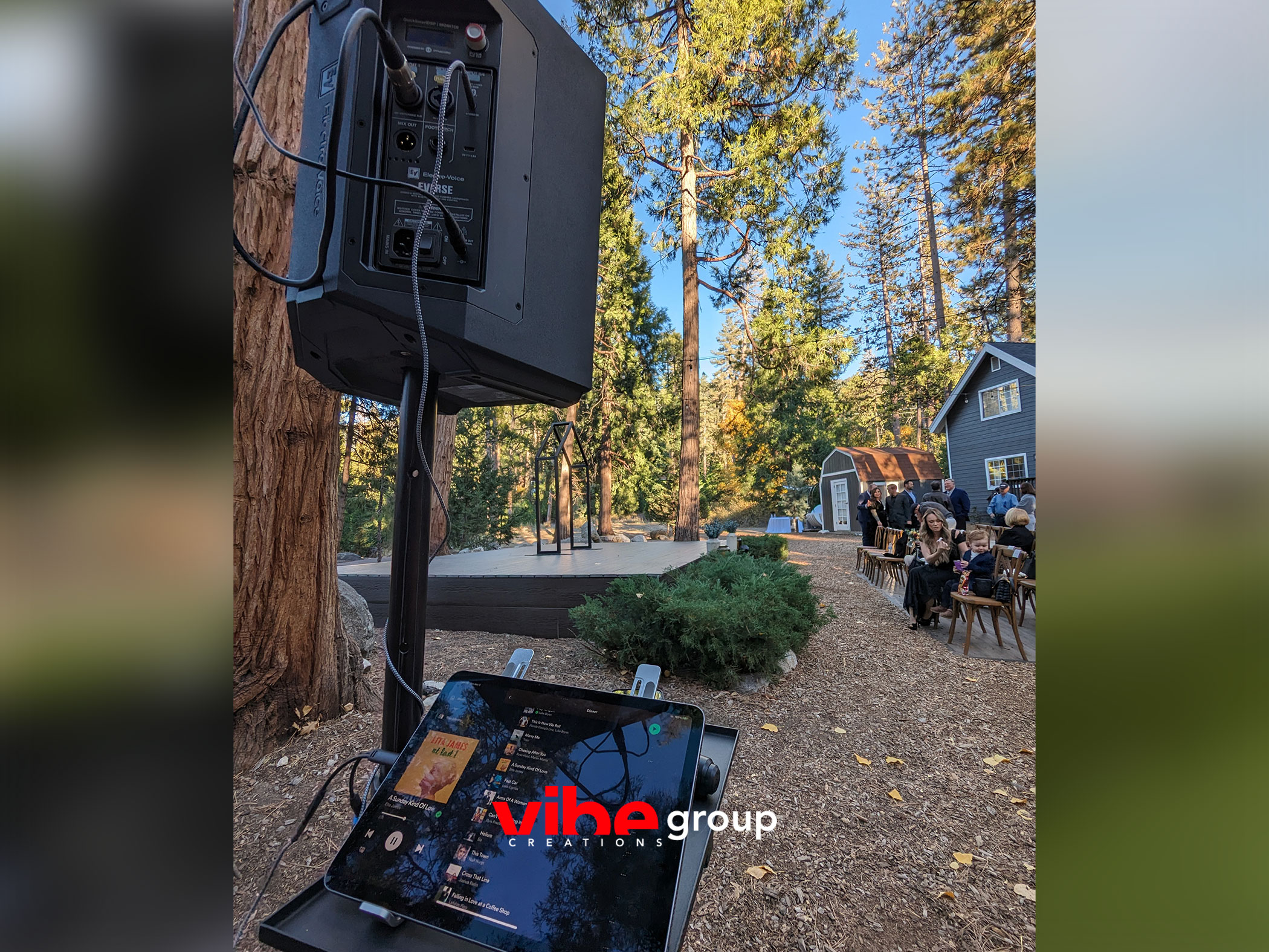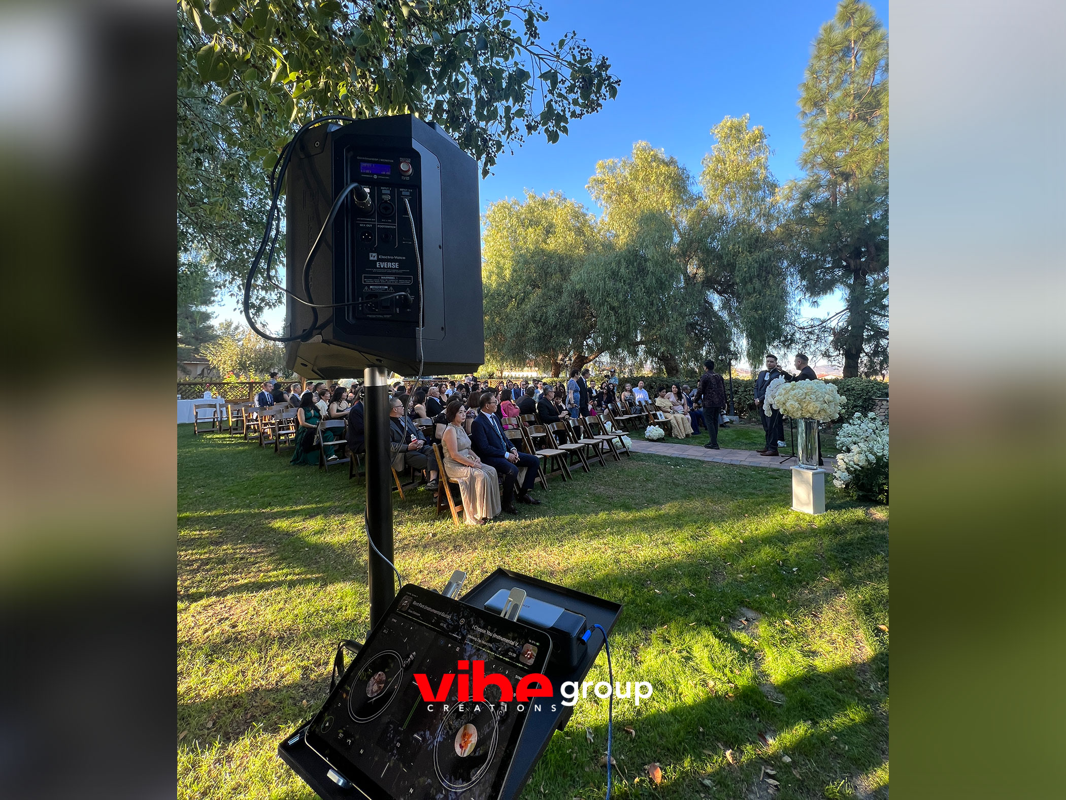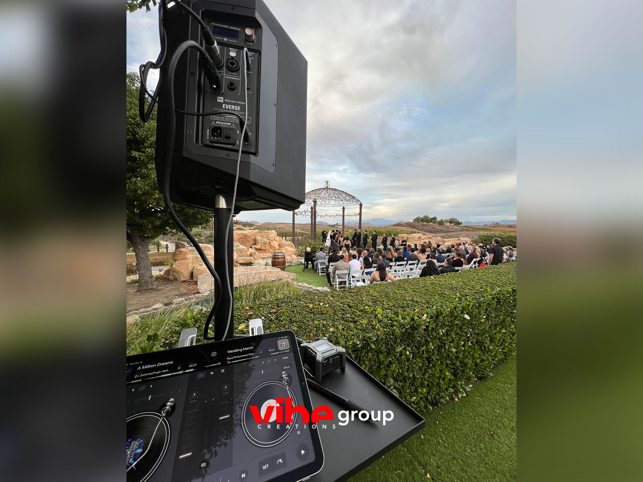 Battery-powered ceremony system & custom ceremony playlist with extended-range wireless mic for officiant & couple.